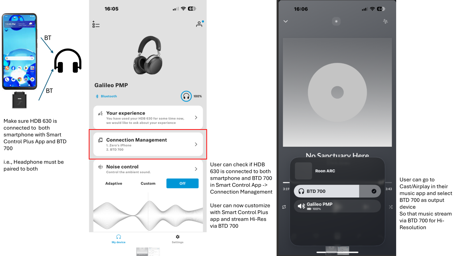 The BTD 700 can be connected to any compatible USB-C device, and must be paired with the headphones before use. To maximize battery runtime, hi-res (24-bit/96 kHz) is not turned on by default, so the user must activate hi-res in the Smart Control Plus App.